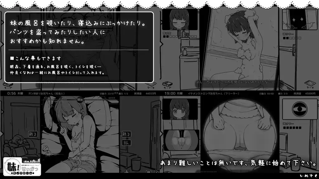 お風呂を覗いたり、寝ている妹にいたずらしてみたり、こっそり妹とのせいかつを楽しむ。